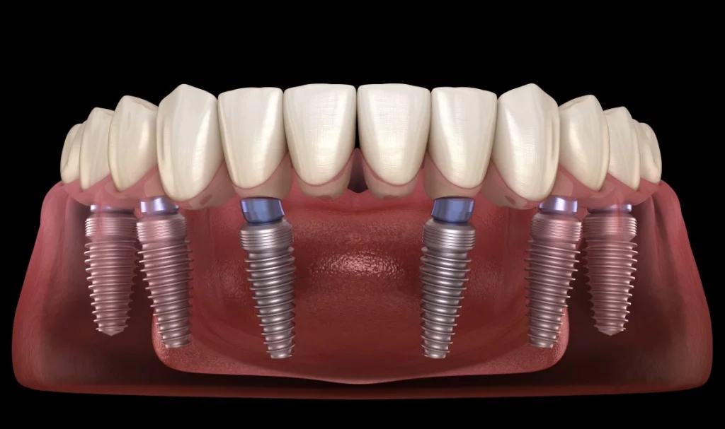 A complete arch of teeth is affixed to either the top or bottom of the mouth, and these are inserted into the jawbone and/or maxillary to replace the natural tooth root.